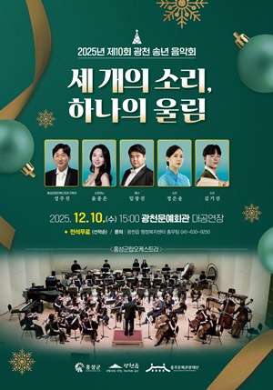 홍성군 광천읍은 2025년을 마무리하며, 지역민들에게 문화 향유의 기회를 확대하고 잊지 못할 감동을 선사하기 위해 ‘제10회 광천 송년음악회 「세 개의 소리, 하나의 울림」’을 개최한다고 밝혔다